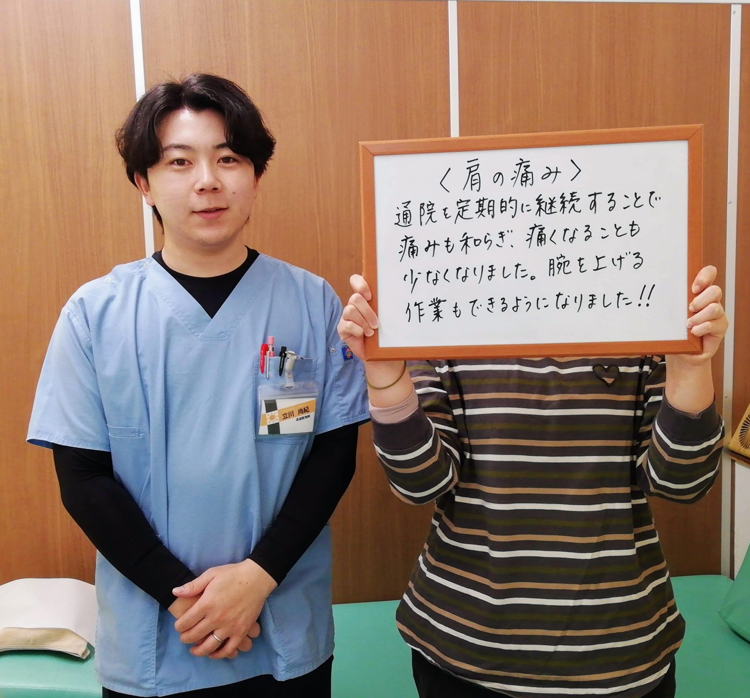 こんにちは!深谷たいよう接骨院・整体院です。 本日は、肩の痛みで通院されていた20代男性の患者様の、嬉しい経過報告をシェアさせていただきます。 🚩 来院時の状況 最初は「肩が痛くて、腕を上げる作業がつらい」というお悩みで来院されました。 20代という若さであっても、お仕事や日常生活での負担が蓄積すると、肩の可動域が制限され、強い痛みが出てしまうことは少なくありません。 施術の経過と変化 こちらの患者様は、お忙しい中でも定期的に通院を継続してくださいました。その結果、素晴らしい変化が見られました! 痛みの軽減: 通うごとに痛みが和らぎ、今では「痛くなること自体が少なくなった」と実感されています。 可動域の改善: 何より、当初つらかった**「腕を上げる作業」**がスムーズにできるようになりました! 💡 継続が「根本改善」への近道です 痛みが出た時だけケアをするのではなく、定期的にメンテナンスを行うことで、お身体の「良い状態」を脳と筋肉が記憶してくれます。 今回、しっかり通っていただいたことが、早期の改善と再発防止につながりました。 「最近、肩が上がりにくくなったな…」 「若いから放っておけば治るかな?」 そんな風に感じている方も、ぜひ一度ご相談ください。 痛みのない、スムーズに動ける体を取り戻しましょう!